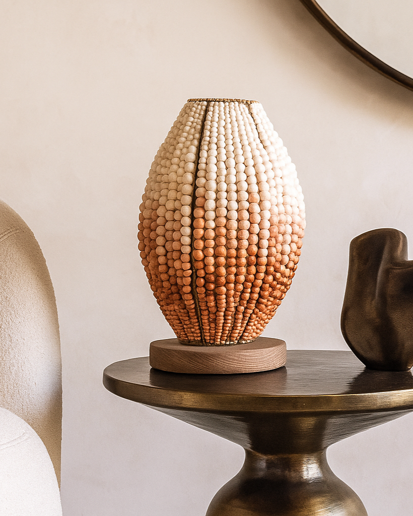 Illuminate your space with soul and sophistication through a masterfully handcrafted piece where sculptural form meets functional art. Individually strung with hand-rolled, kiln-fired clay beads, each dyed in organic pigments, this lamp radiates texture, elegance, and warmth. Forged on a wrought iron frame by artisans in Kwazulu Natal, South Africa, this piece stands as a tribute to traditional craftsmanship and contemporary design. Perfect for the discerning collector seeking decor with depth, story, and sustainable beauty.