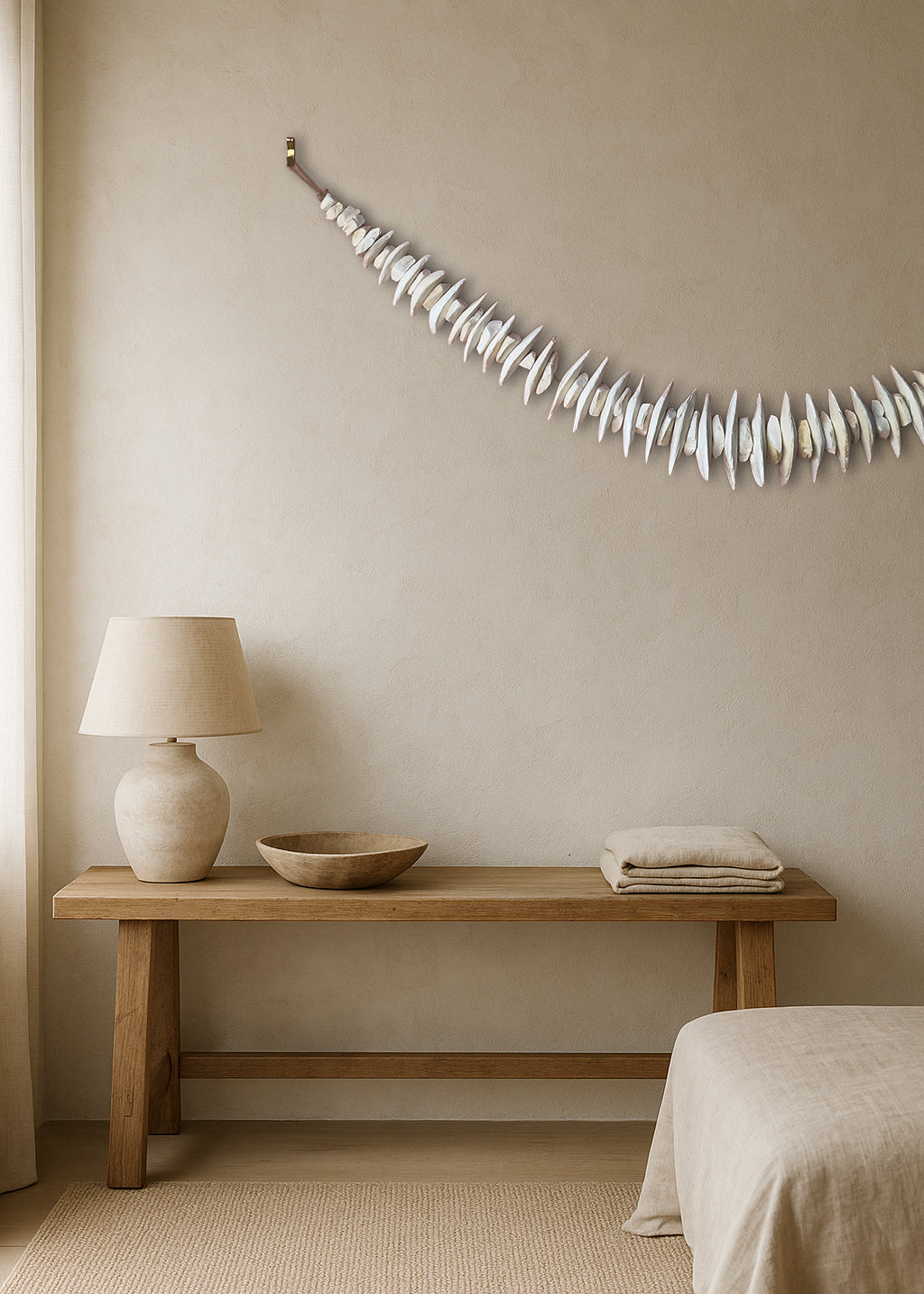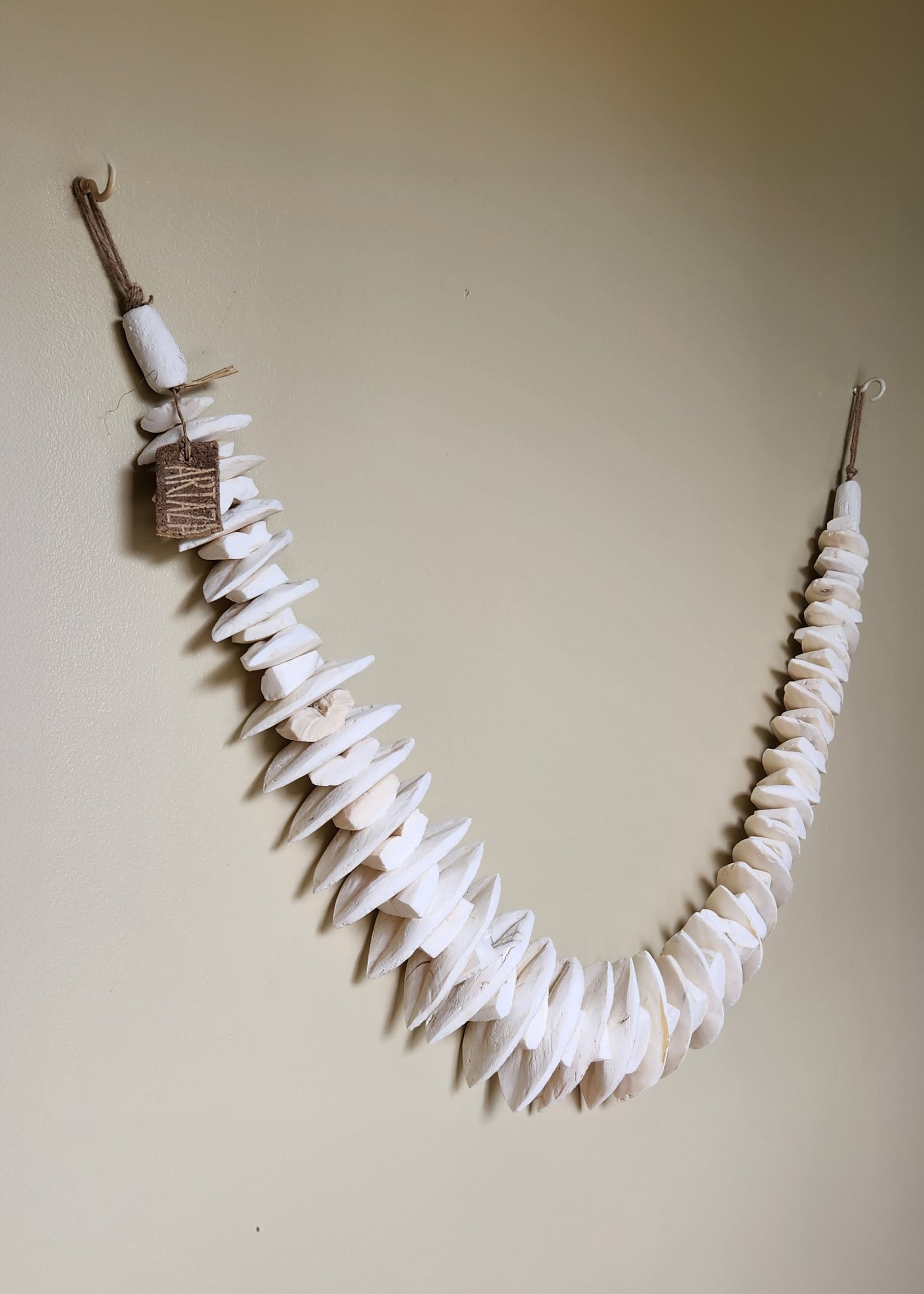 Featuring an elongated design, this wall hanging is crafted from matte-white sepia bone and hand-rolled clay beads on natural jute. Each element is shaped and strung by hand, creating a striking, tactile piece rooted in artisanal skill.