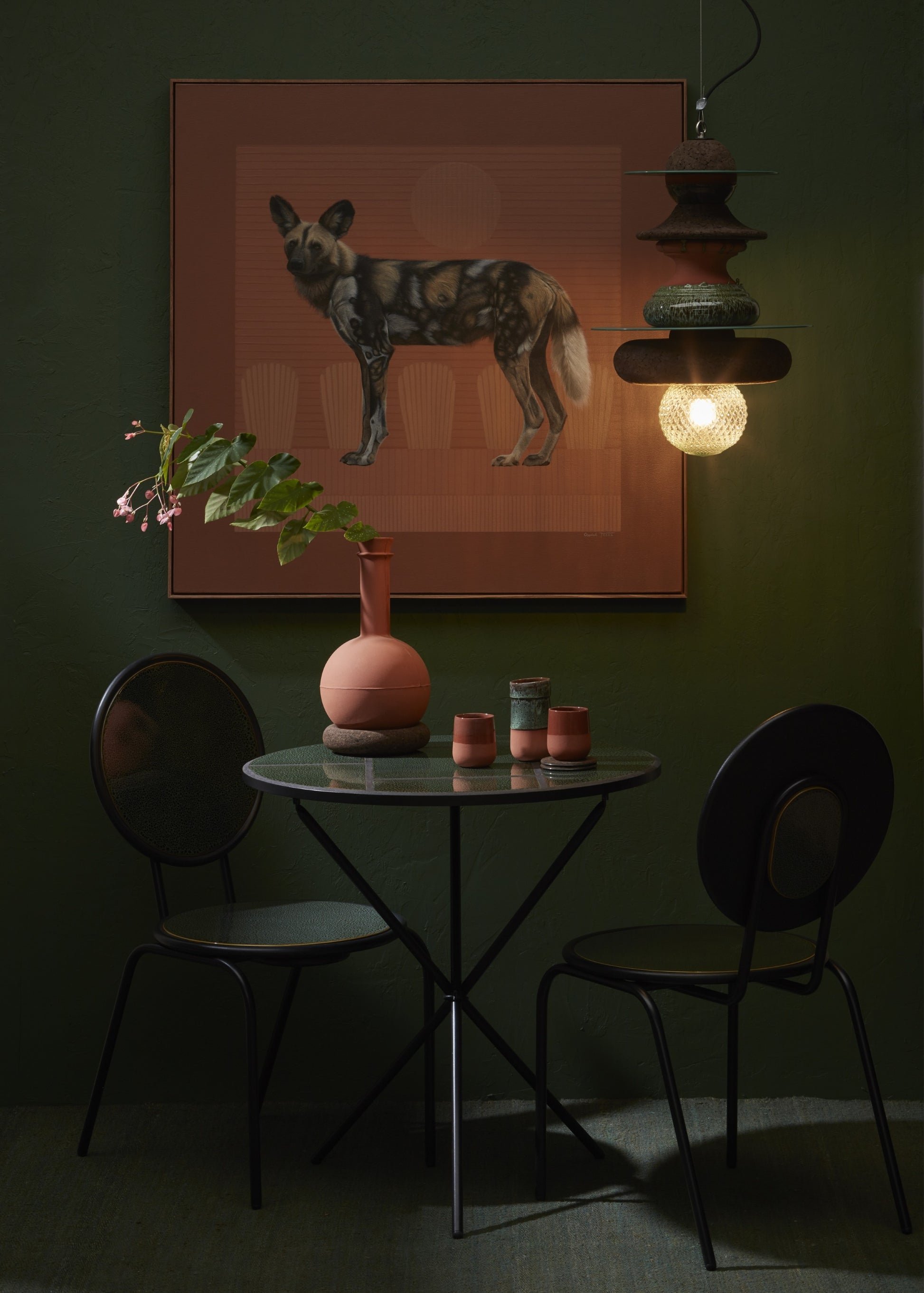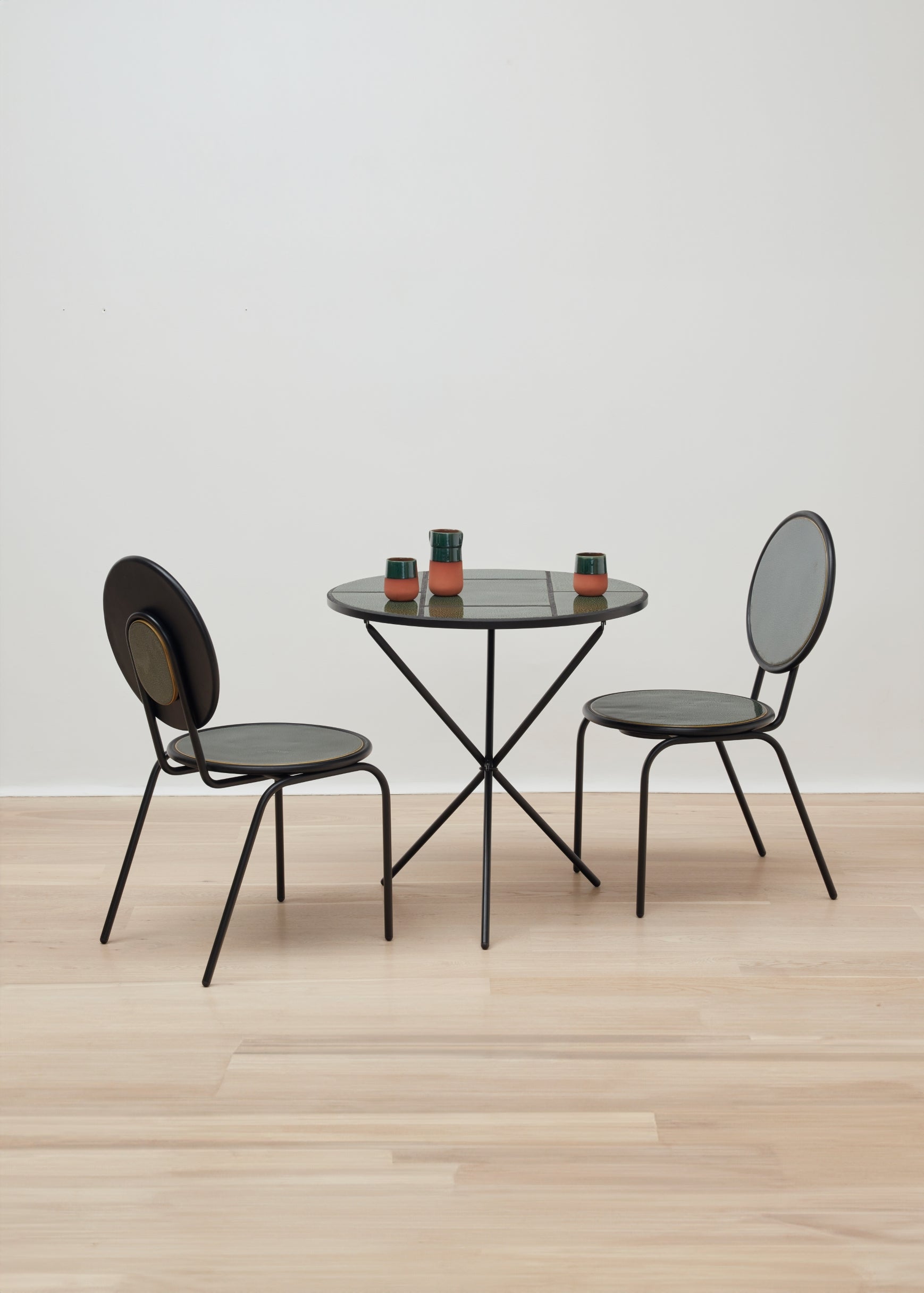 A contemporary café-style table crafted for compact living, this design features rich forest green glazed ceramic tiles set into a textured black stainless steel frame. Perfect for patios, balconies, or indoor nooks, it folds easily for storage or display and offers an eye-catching mix of function and artistry. Every detail, from the hand-glazed tiles to the durable materials, is considered for both beauty and practicality.