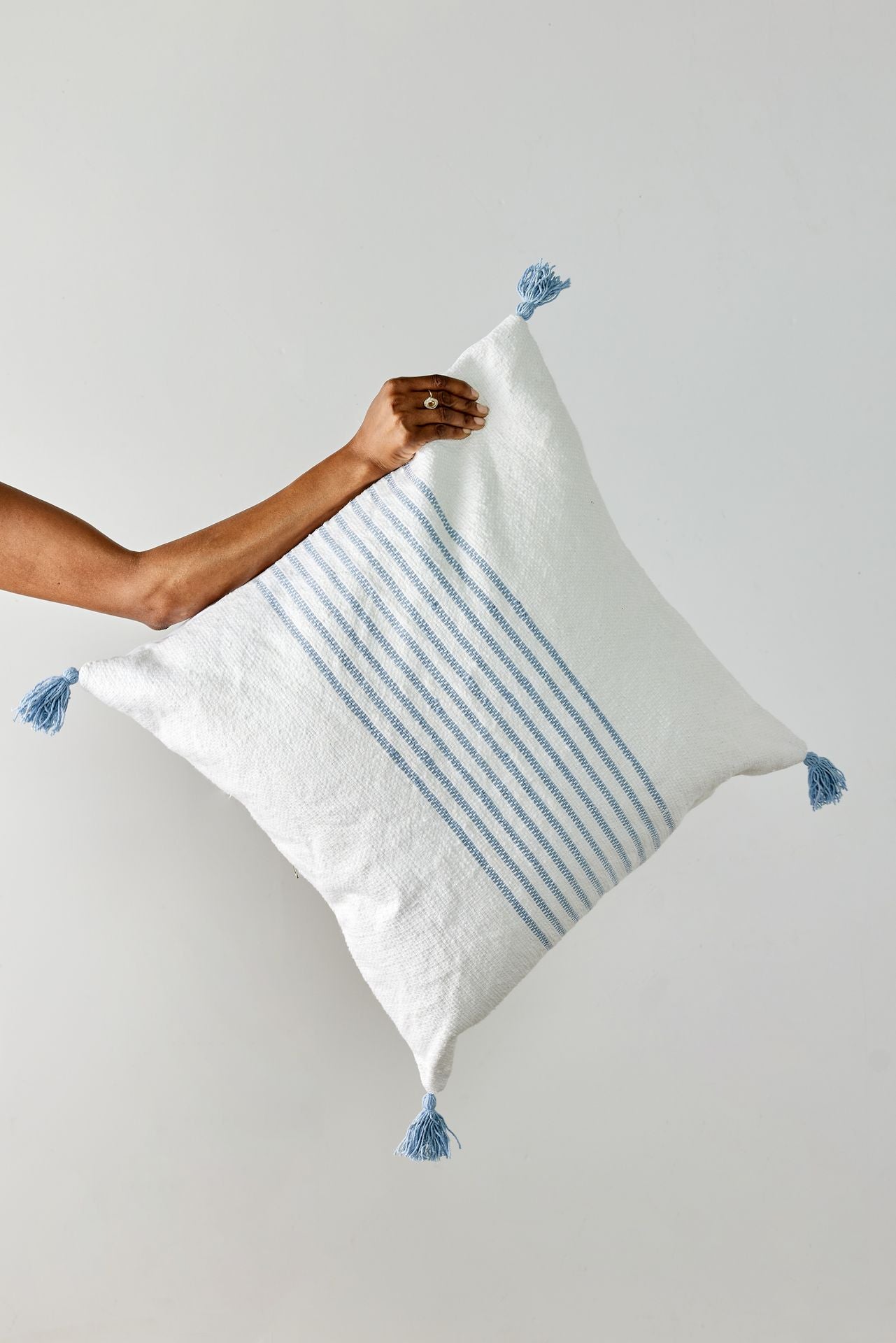 Werten Sie Ihren Wohnraum mit dem Boho Light Blue Stripe & Tassel Throw Pillow auf, ein Beweis für die handwerkliche Geschicklichkeit südafrikanischer Kunsthandwerker. Dieses handgewebte Meisterwerk weist ein auffälliges Muster aus hellblauen Streifen auf, das durch verspielte Quasten an jeder Ecke wunderschön ergänzt wird. Dieses dekorative Kissen aus 100 % Baumwolle verleiht Ihrer Einrichtung nicht nur einen Hauch von Bohème-Charme, sondern bietet auch gemütlichen Komfort.