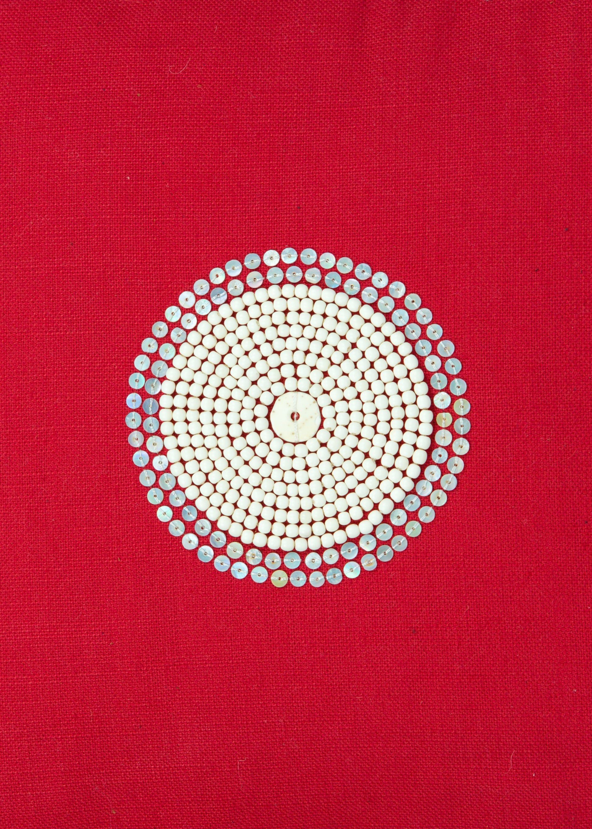 Kanju’s Maasai Pillow is named to honor the Maasai people of southern Kenya and northern Tanzania, known for their elaborate and sophisticated dress and customs. The design features a central ostrich shell pendant (drilled by hand from ostrich egg shell) framed by a solid ring of wooden seed beads and outer halo of hammershell sequins.