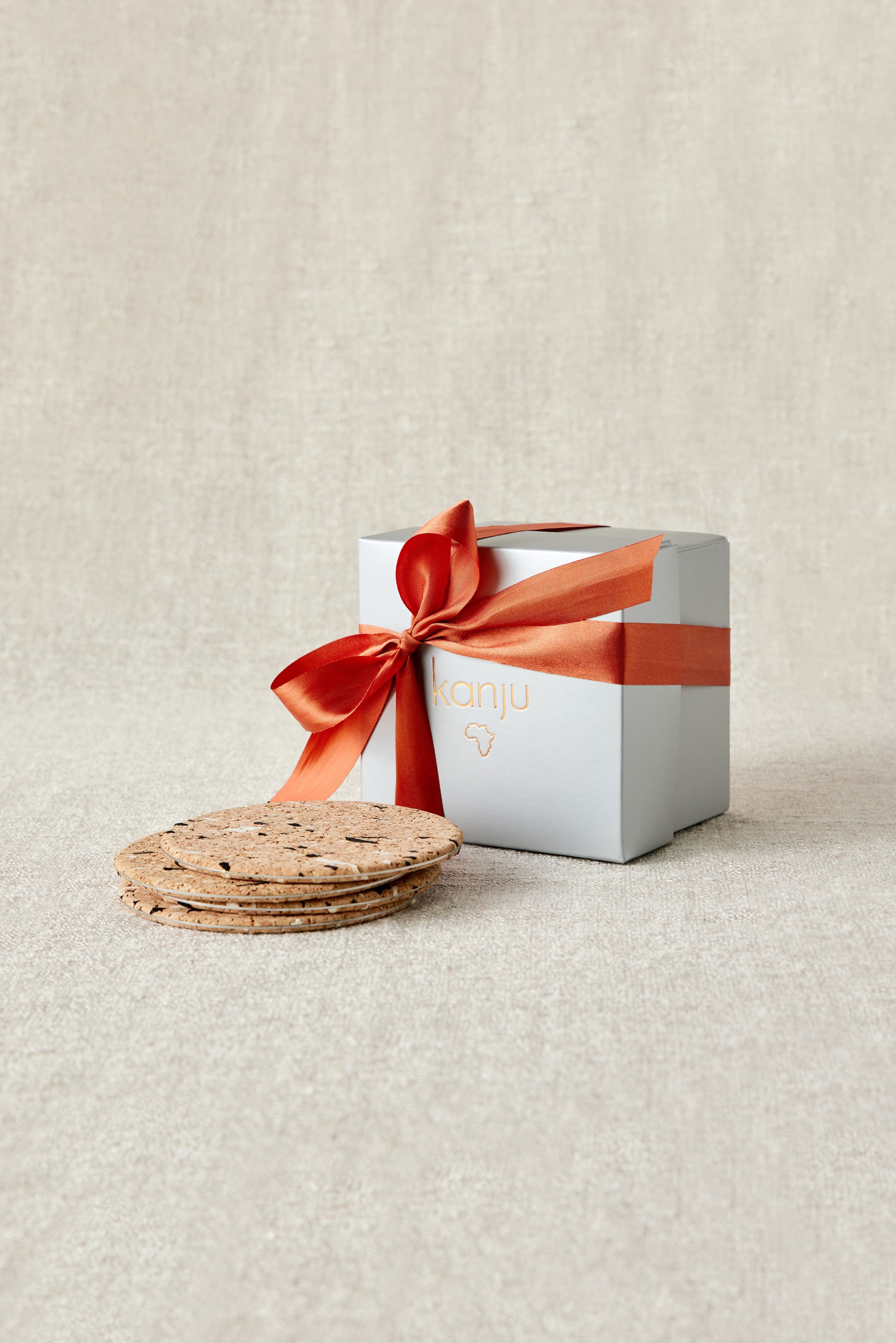 Setzen Sie mit diesen handgefertigten Untersetzern aus Kork und Stahl auf Nachhaltigkeit und einzigartiges Design. Dieses langlebige Set aus 4 Untersetzern ist aus leichtem Verbundkork, recyceltem Gummi und Edelstahl gefertigt. Die laminierte Edelstahlscheibe zwischen den Korkschichten sorgt für Festigkeit und Stabilität. Diese von der weltberühmten Kunsthandwerkerin Laurie Wiid vann Heerden entworfenen Untersetzer bestehen ausschließlich aus recyceltem Kork und sind somit eine umweltfreundliche und moderne Ergänzung für Ihr Geschirr.
