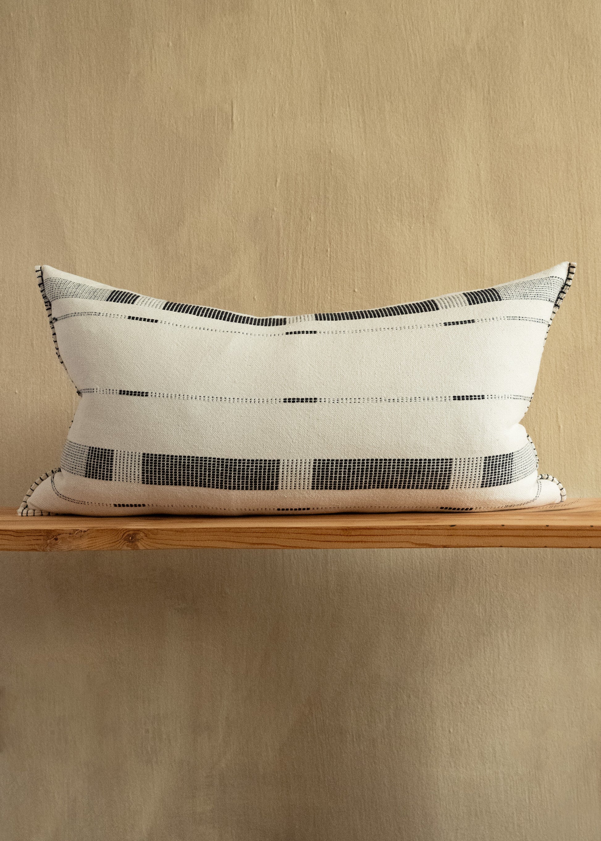 Das Fulcrum Oversized Lumbar Pillow ist mit Perlmuttknöpfen aus lokaler Produktion verziert, die seiner milchigen Naturtextur einen Hauch von Eleganz verleihen. Die umweltschonenden Färbe-, Web- und Veredelungsprozesse sorgen dafür, dass dieses Lumbar Pillow ebenso nachhaltig wie schön ist. Jedes Kissen weist natürliche Unregelmäßigkeiten und Farbabweichungen auf und würdigt die Hände und die Erde, die es hergestellt haben.