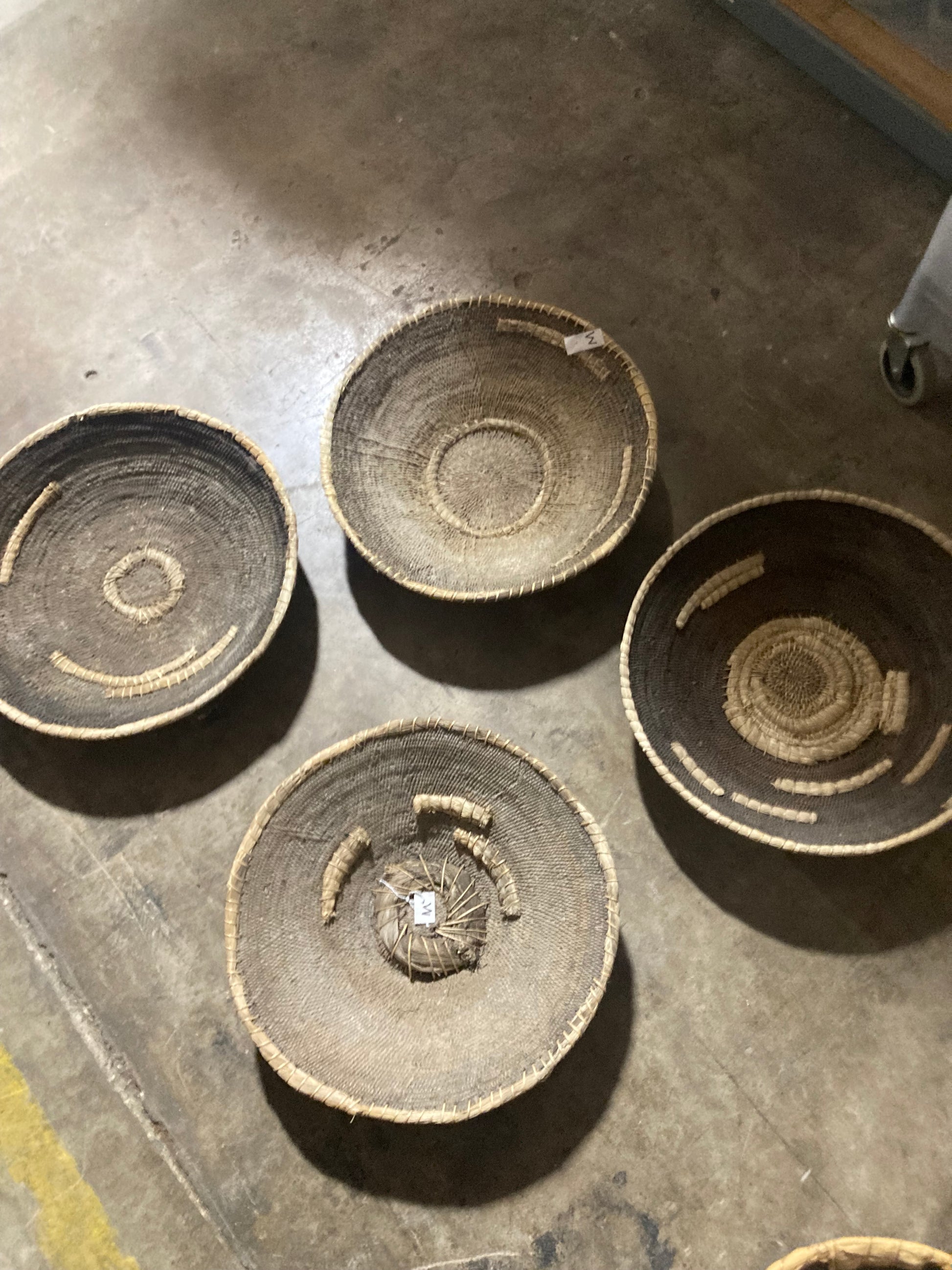 Die markante, ungezähmte, gekrümmte Wurzel an den Rändern einiger Körbe ist eine bewusste Wahl, um dieses faszinierende Detail zu erhalten und die Handwerkskunst und reiche Geschichte dieses Stücks hervorzuheben. Diese Körbe bieten nicht nur dekorative Schönheit, sondern auch eine tiefe Verbindung zu afrikanischen Webtraditionen.