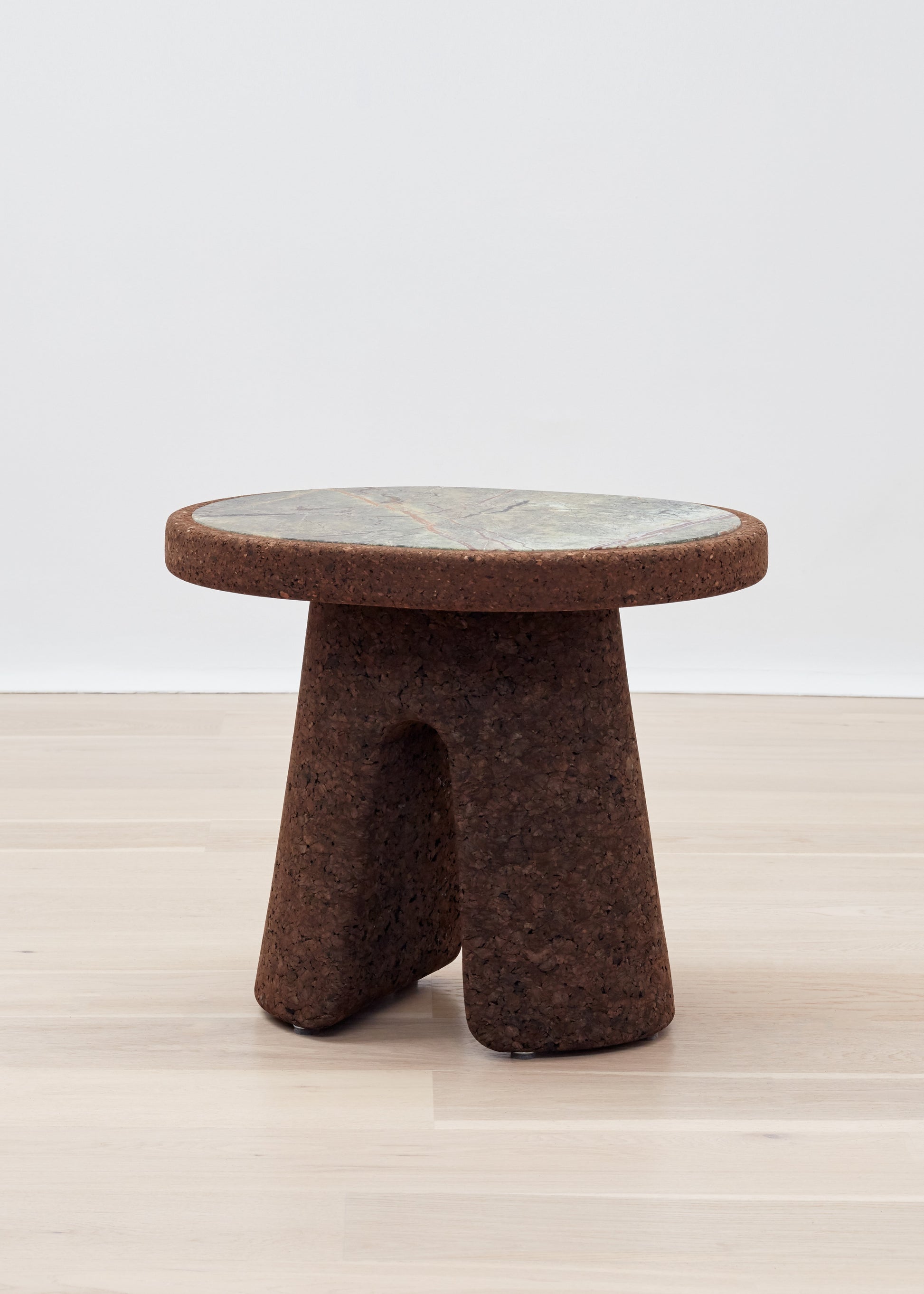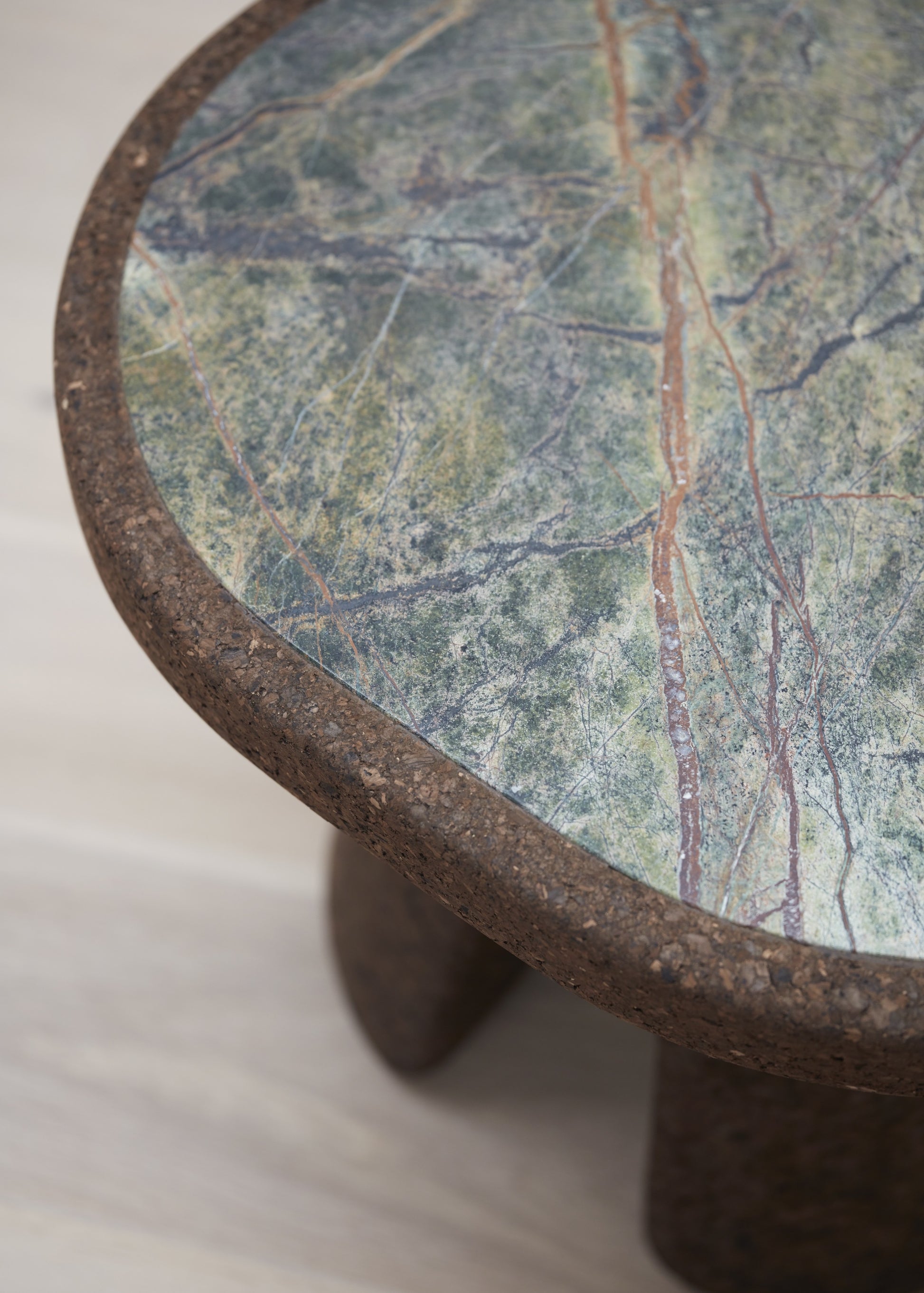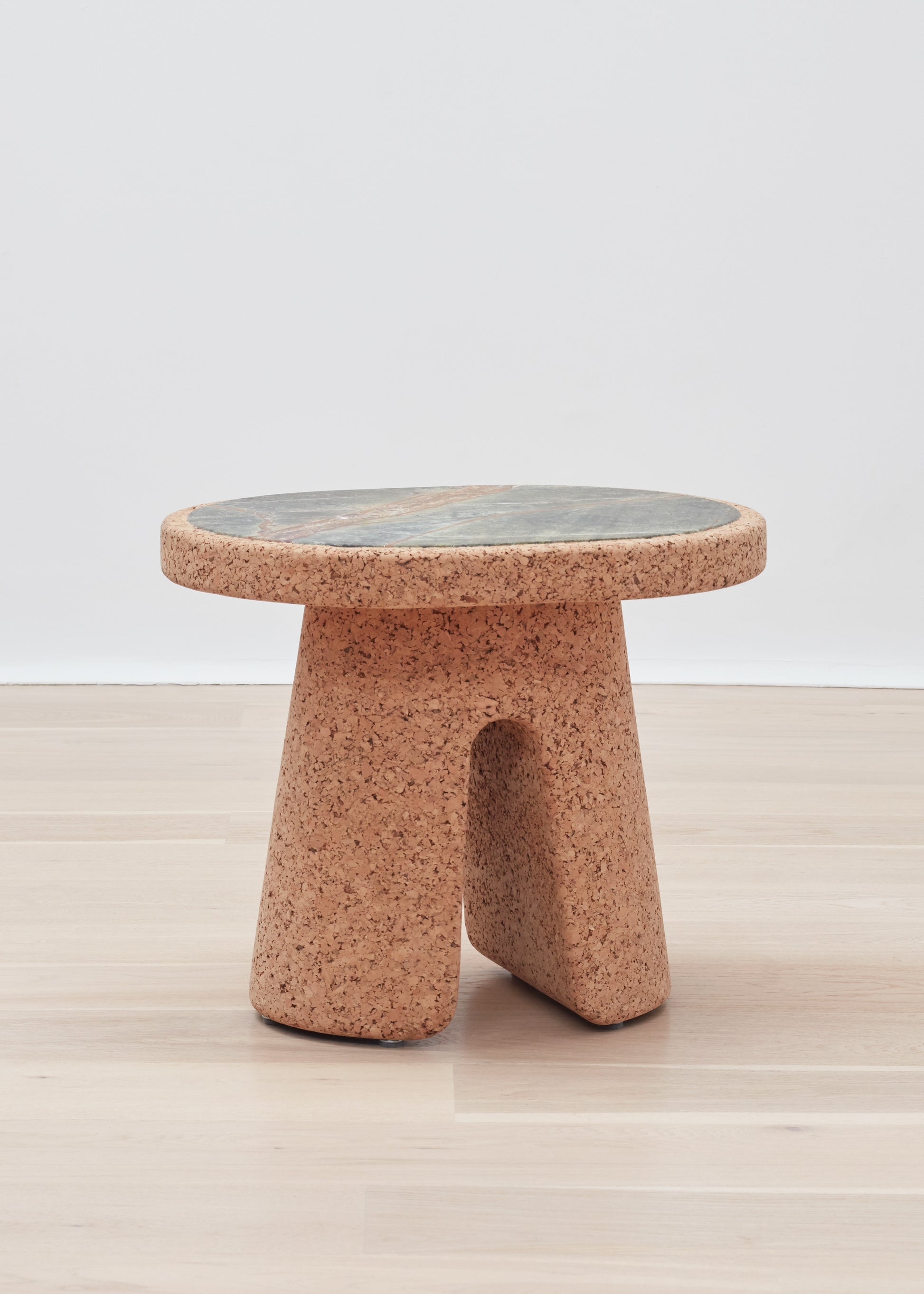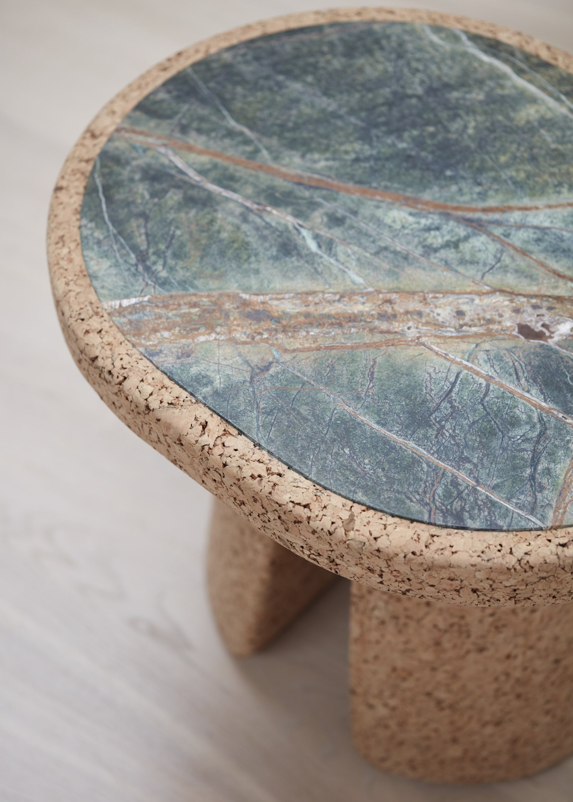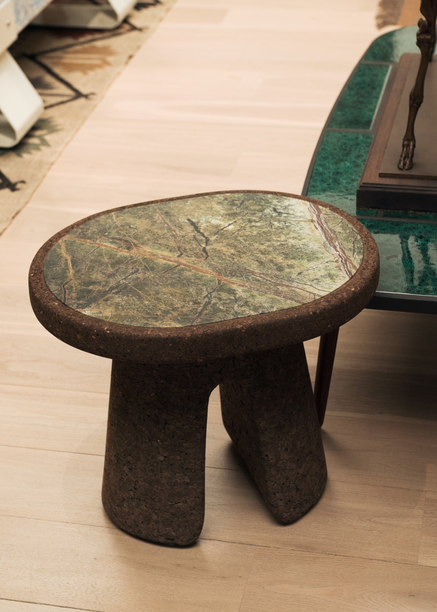 Blending heritage and high design, this oval side table layers the natural texture of cork with the depth and elegance of Italian marble. Its unique form, inspired by the African headrest, offers a grounded beauty that’s tactile and timeless. Designed for the collector of pieces with story and substance.
