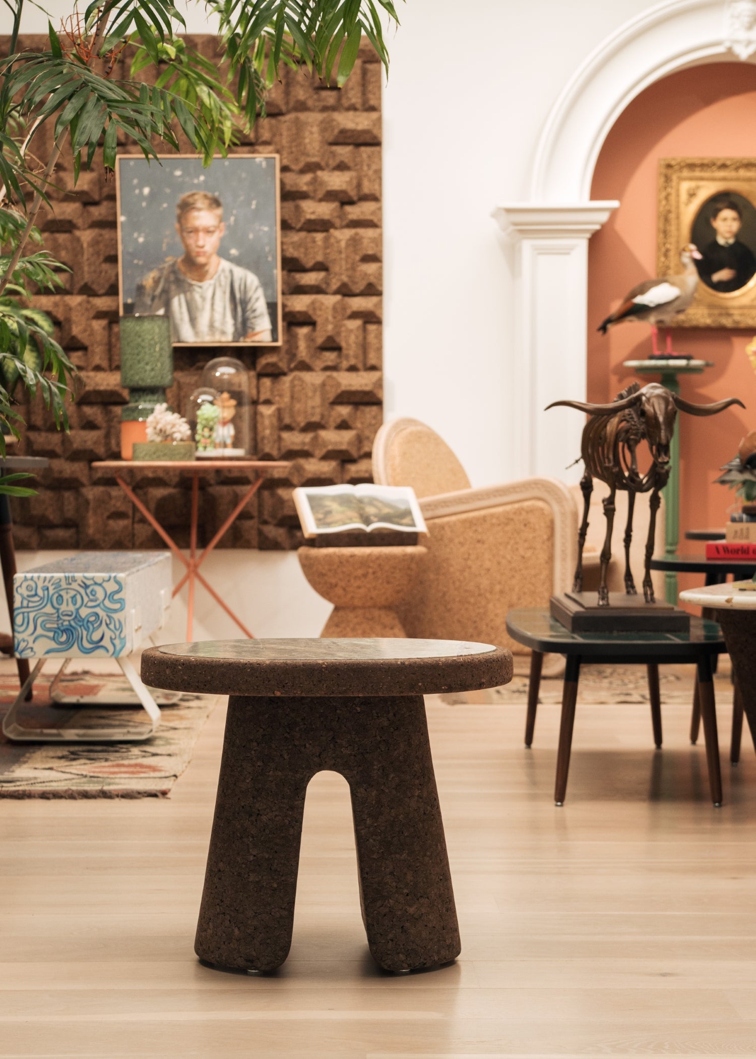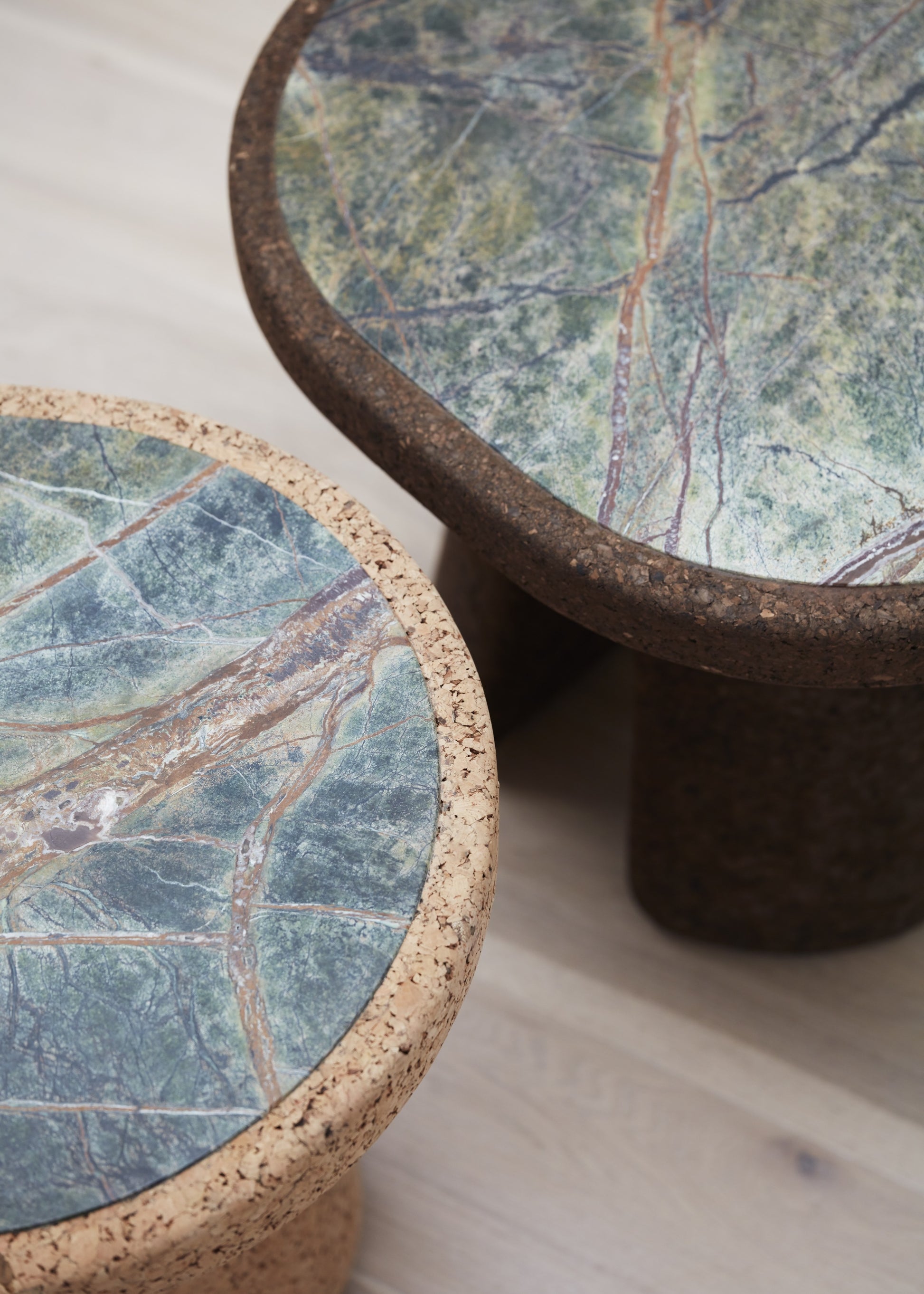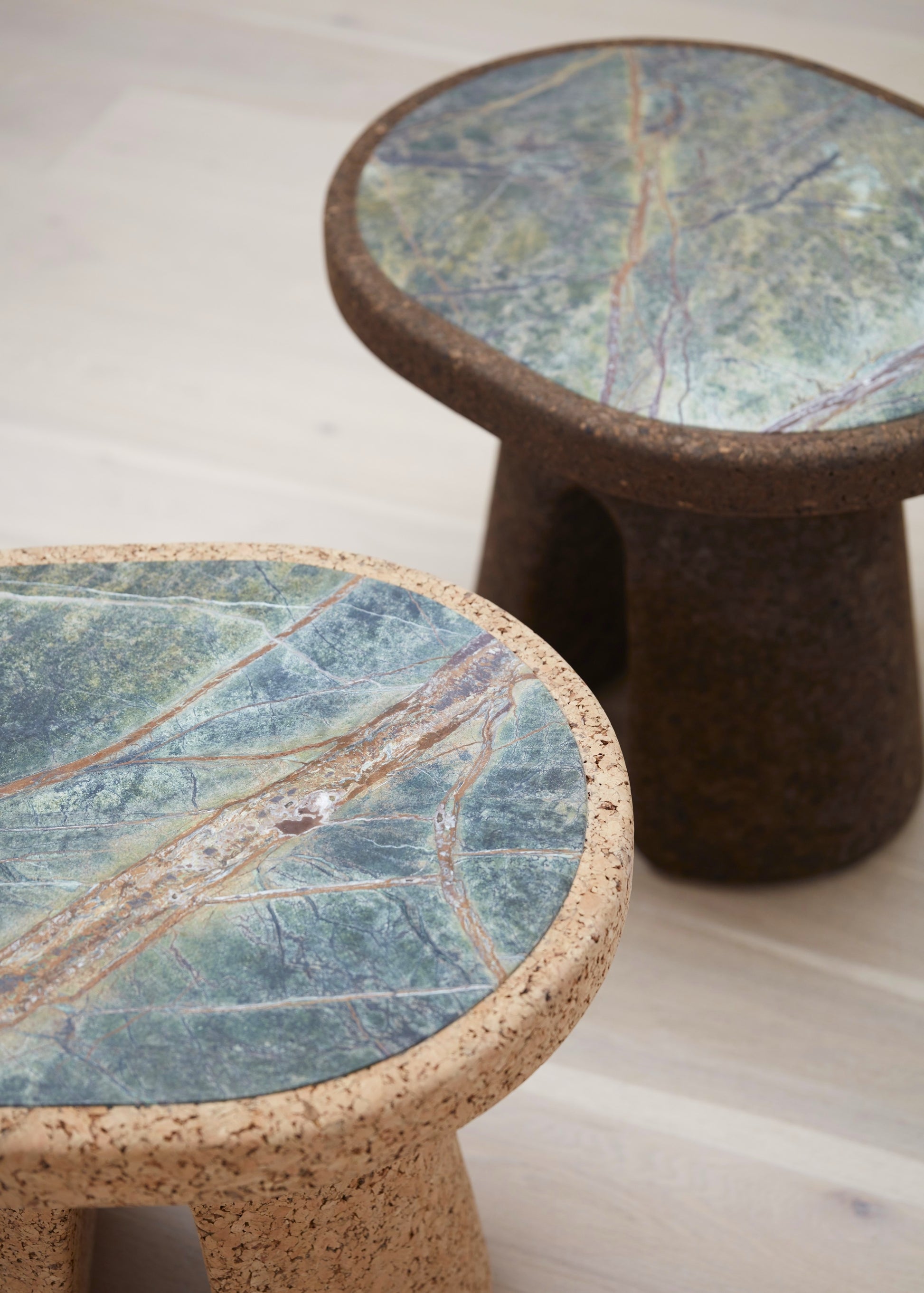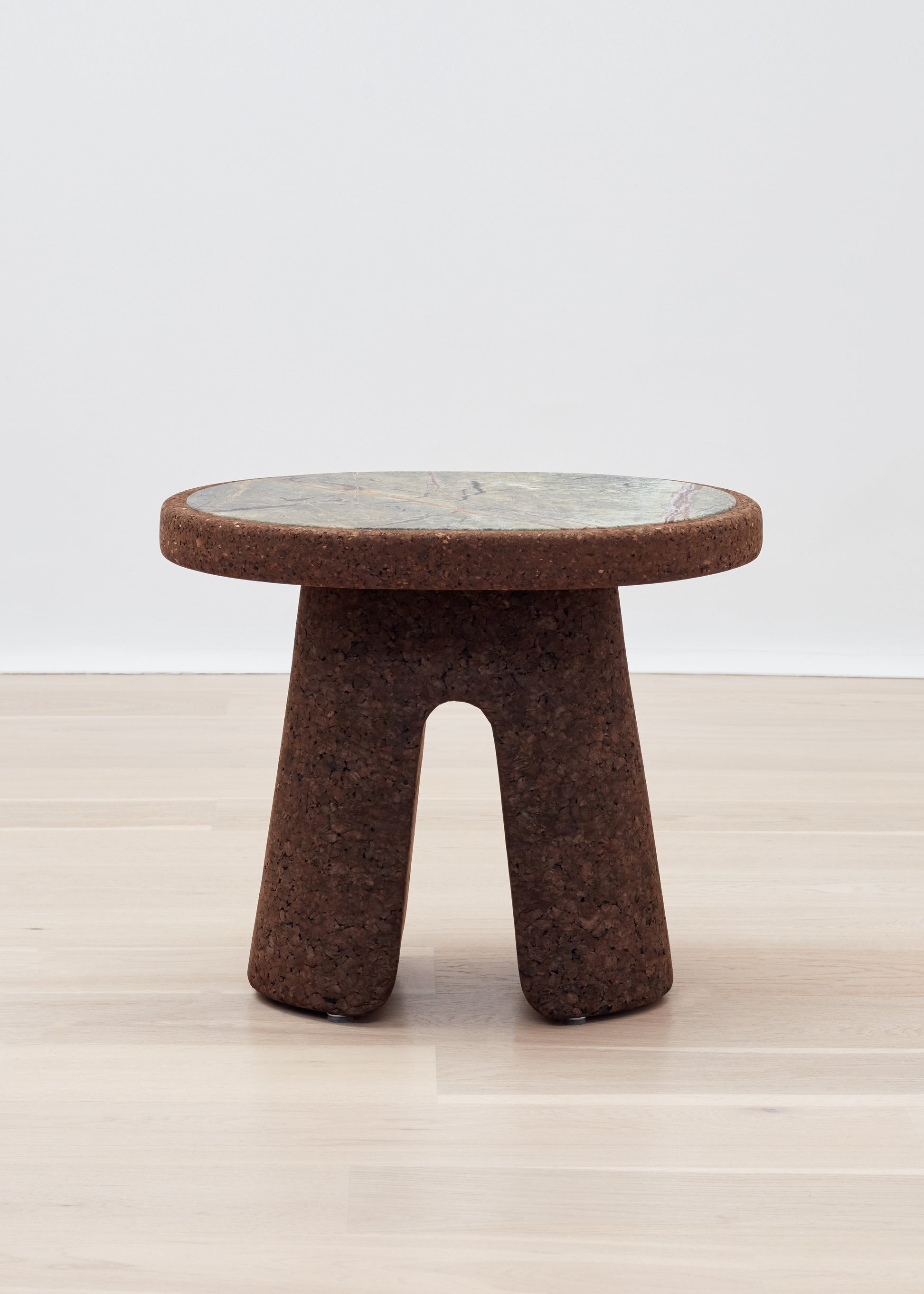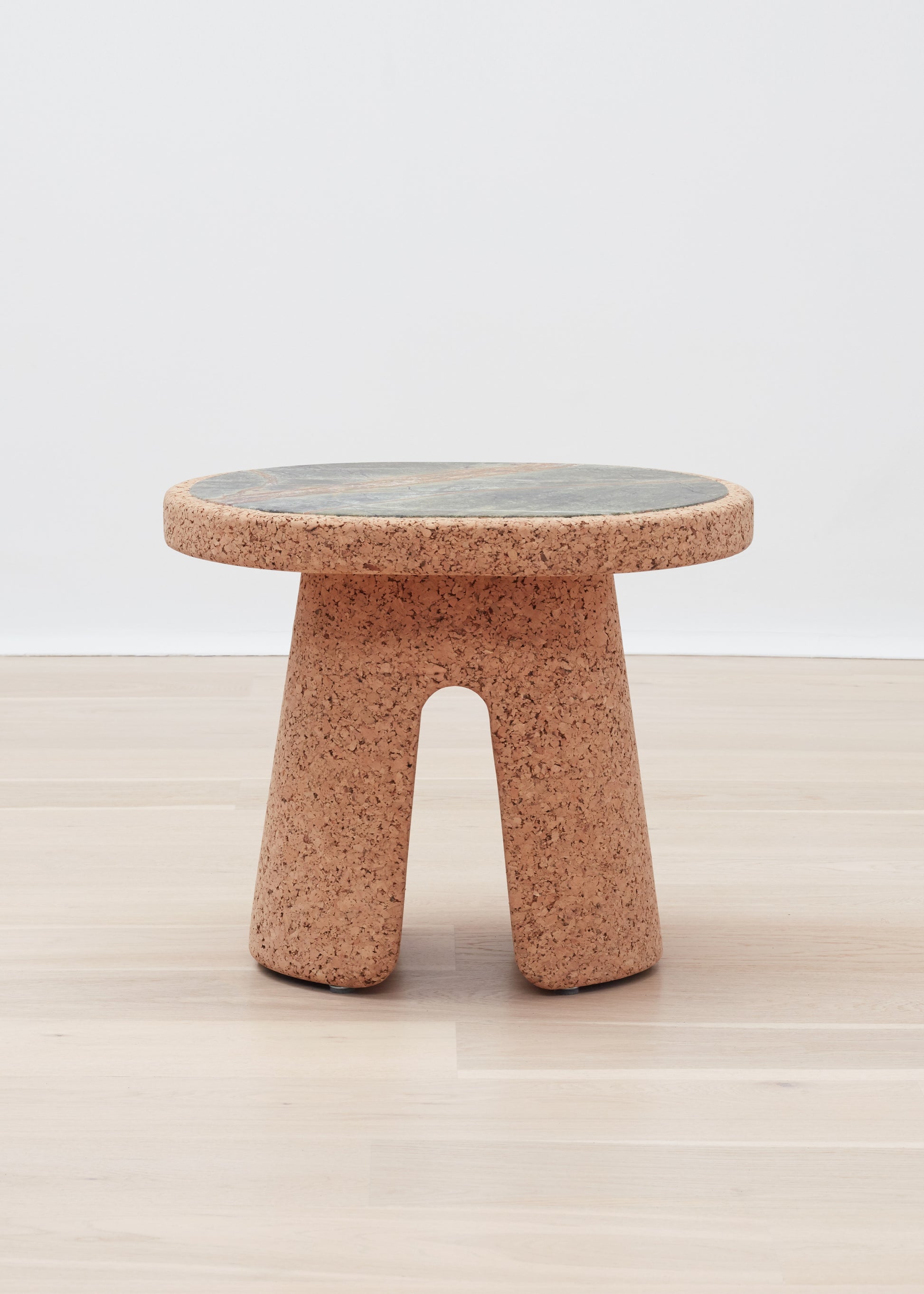 Blending heritage and high design, this oval side table layers the natural texture of cork with the depth and elegance of Italian marble. Its unique form, inspired by the African headrest, offers a grounded beauty that’s tactile and timeless. Designed for the collector of pieces with story and substance.
