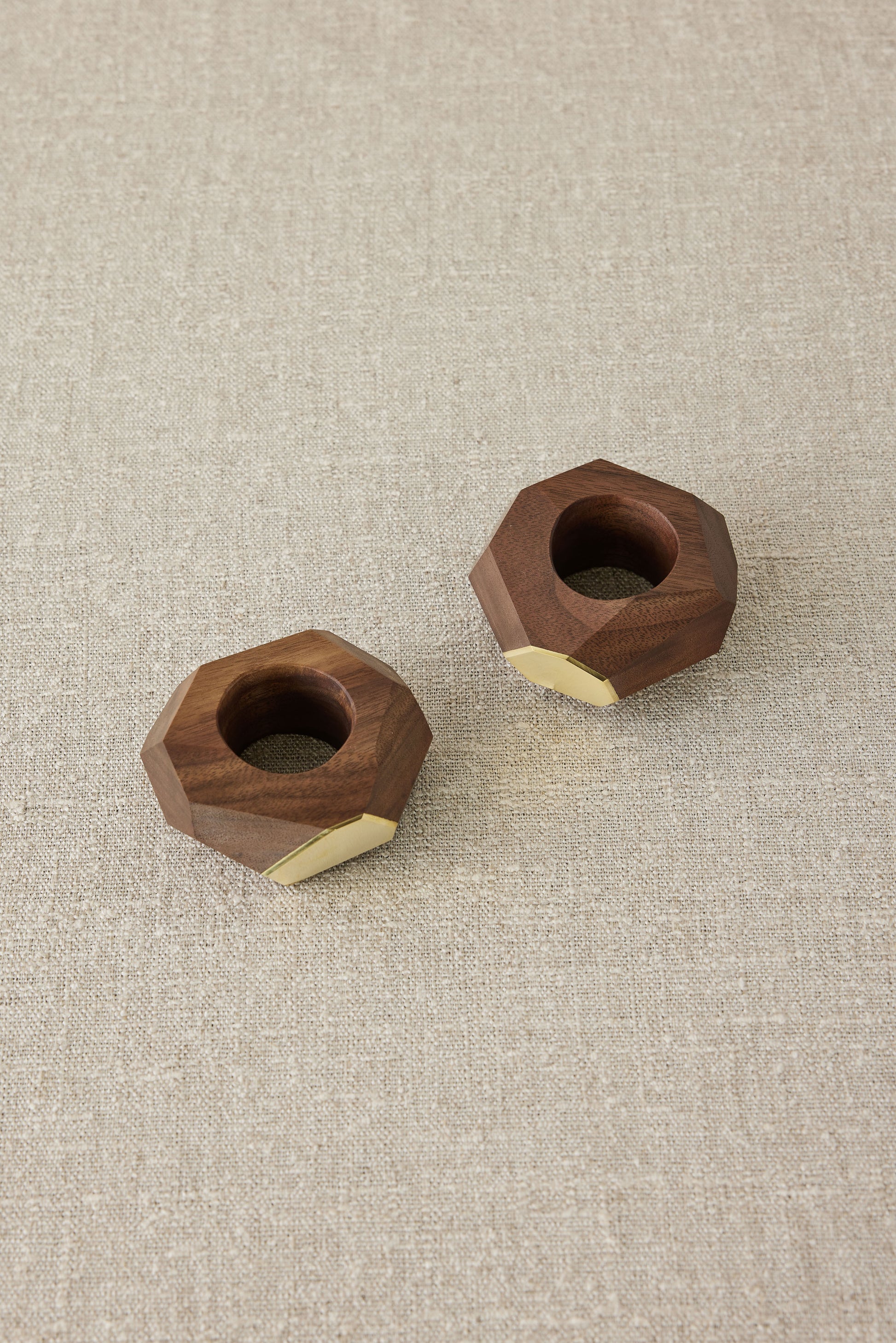 Hand carved, faceted wood napkin rings are available in a variety of woods and add equal parts elegance and drama to any table setting. Each Napkin Ring is unique in overall shape and arrangement of the facets, but all have the same inner ring dimension. Each napkin ring is sanded down to a very fine, smooth finish and oiled with food safe Danish wood oil, and a hand cut, polished brass plate is applied to one facet. The rings are made from American Walnut, one of the most durable hardwoods, and have a deep chocolate color with reddish-purple streaks and a beautiful luster.