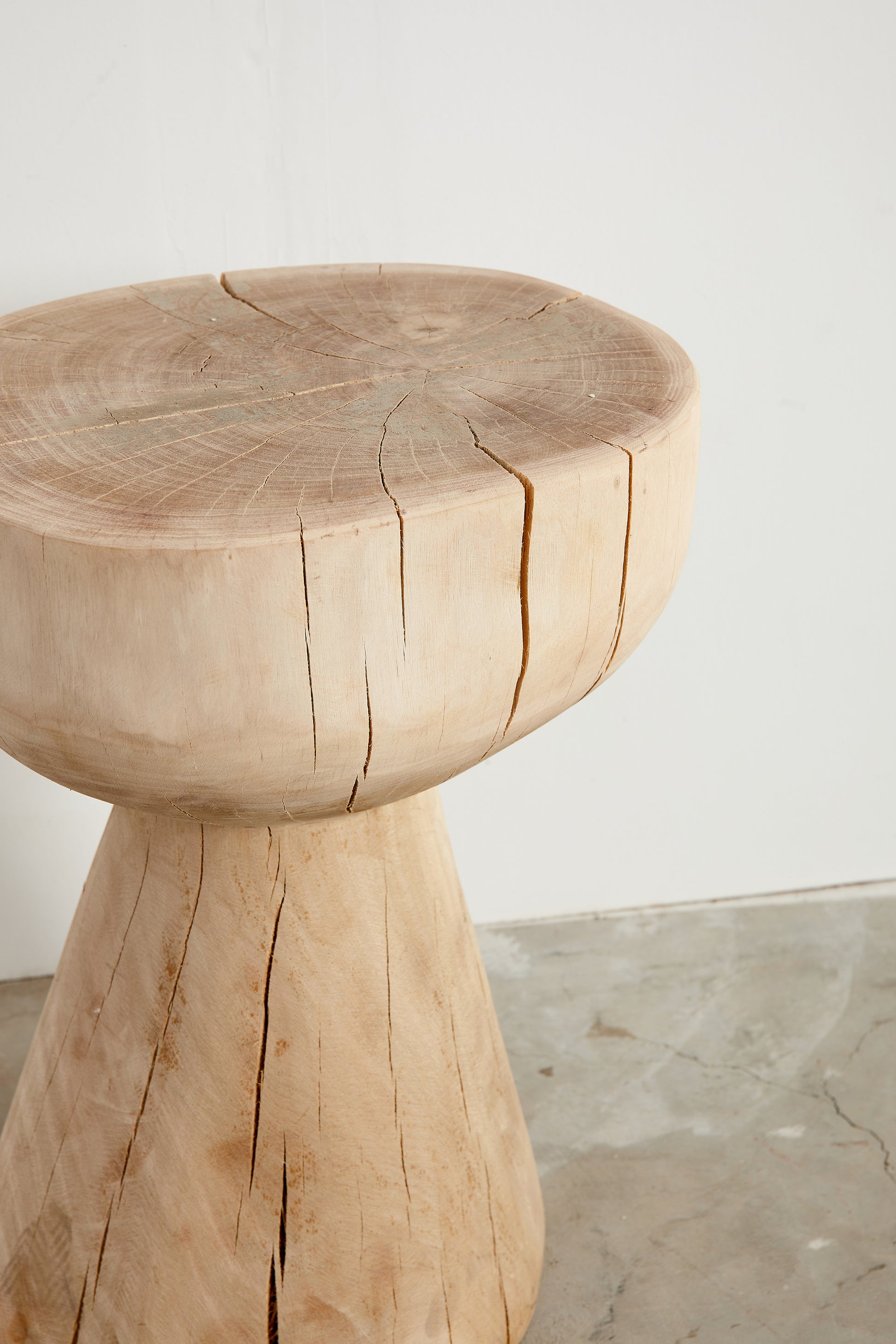 Marked by generous organic curves, dramatic fissures, and richly textured grain, the Sazana Stool celebrates the wabi-sabi beauty of imperfection. This particular piece features large visible cracks, which enhance its sculptural presence and serve as a testament to the material’s living history and transformation over time.