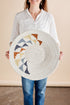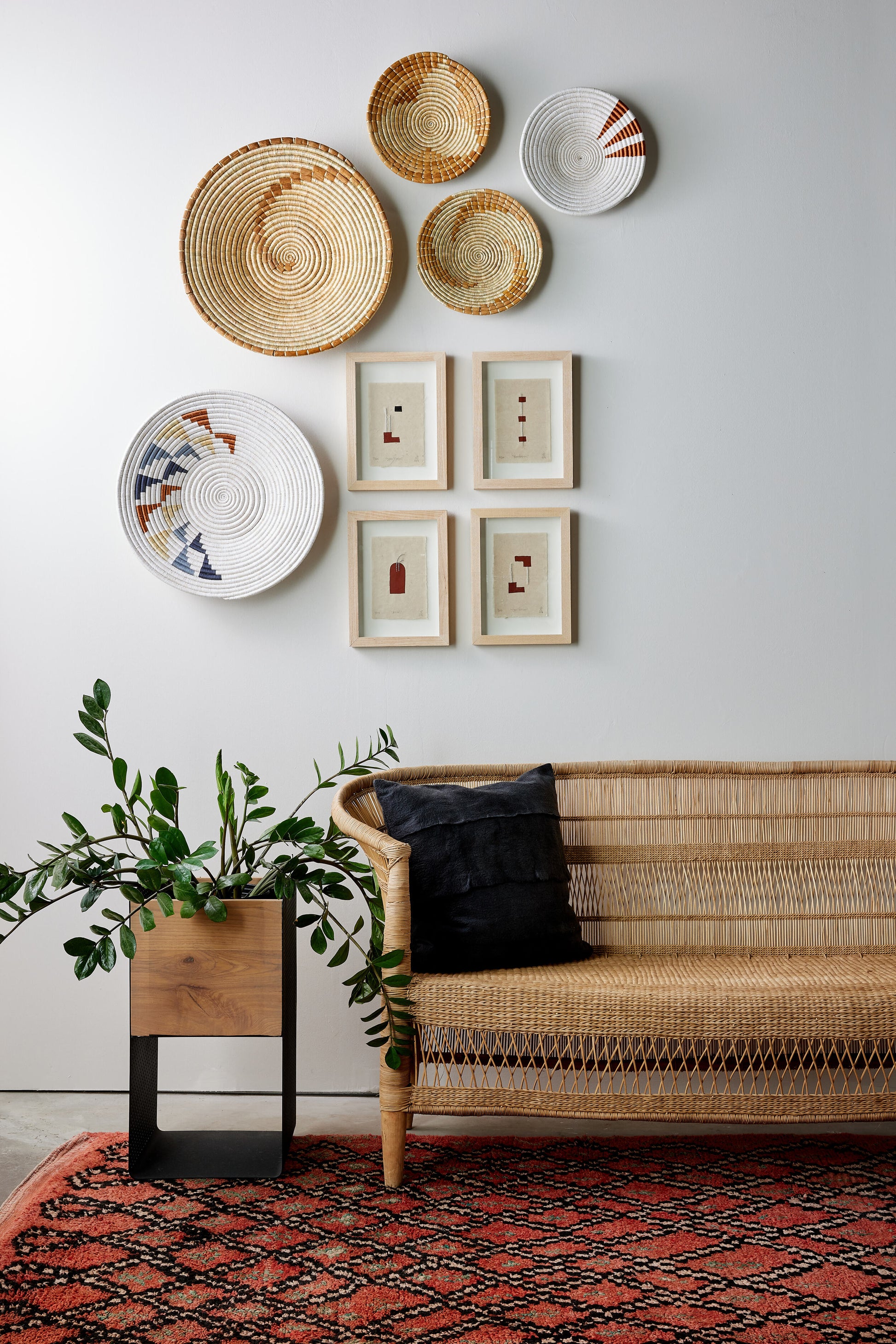 Decorate your space with the exquisite craftsmanship of the Wimbi Wall Basket, a unique piece created by WomenCraft artisans for MADE51, a global brand of refugee-made products. The basket is crafted from upcycled "Gunia" grain sacks and colored sewing thread, intricately woven into natural grasses. Each piece is shaped like a shallow bowl and comes with a hanger on the back for easy wall mounting. The intricate weaving techniques have been passed down through generations, making each basket a masterpiece that takes several days to complete.